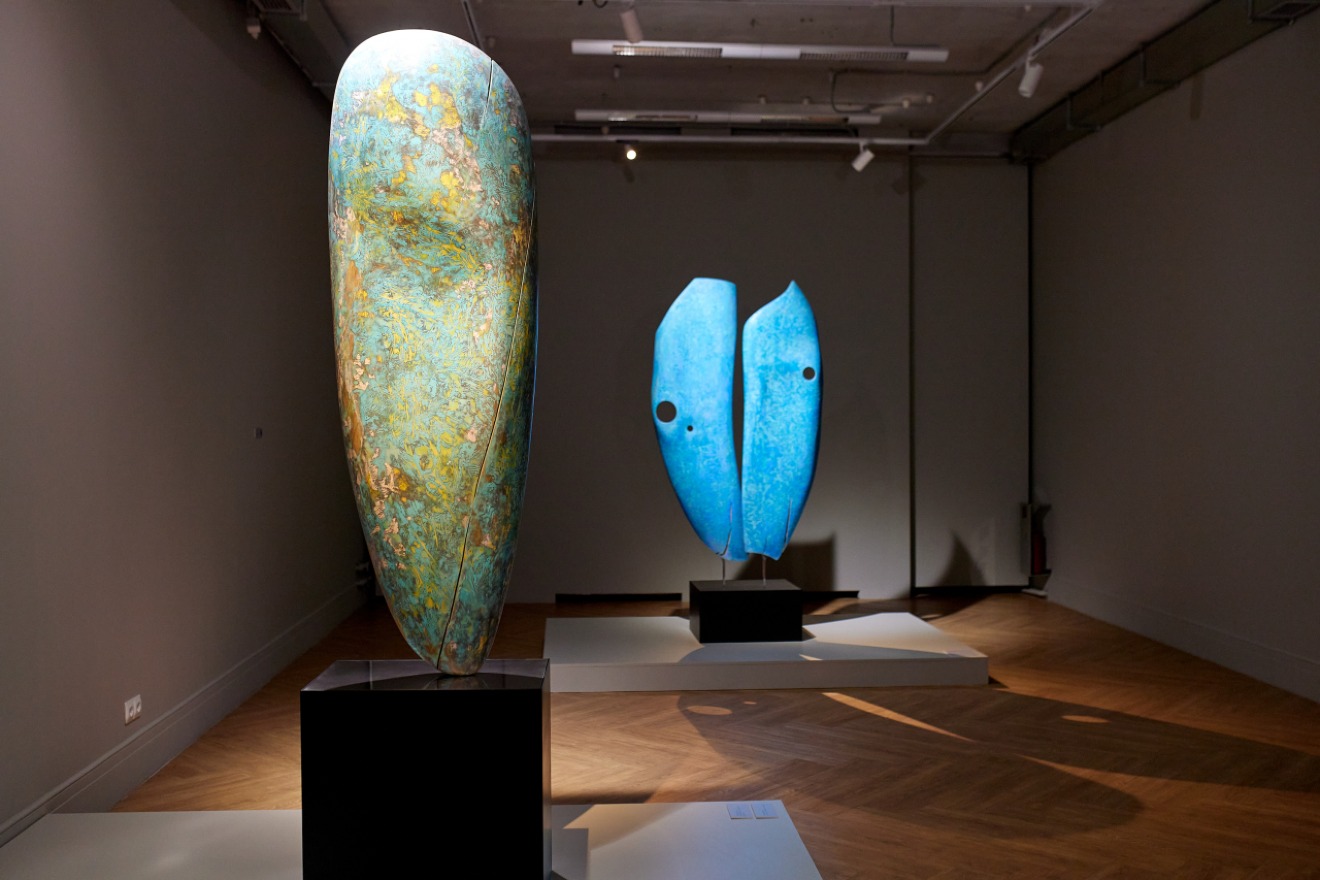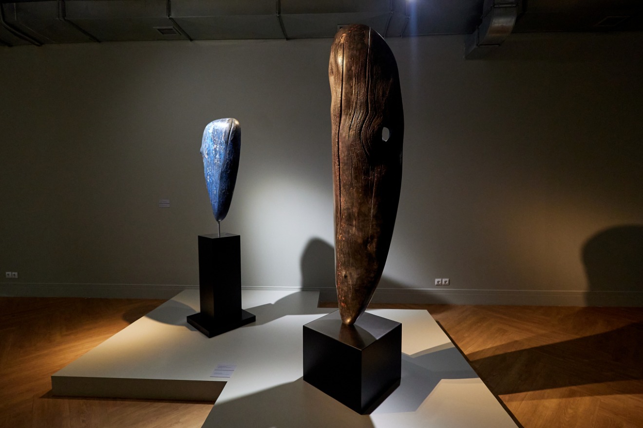 Каждая из представленных работ напоминает маски, воплощающие образы бурятских онгонов — традиционных масок, используемых в ритуальных обрядах. Именно эти древние символы стали источником вдохновения для мастера, который решил обратиться к новому материалу после знакомства с небольшой деревянной головой лося в иркутском музее несколько лет назад.