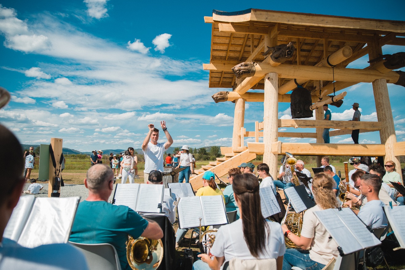 Возле нового объекта было запланировано вечернее выступление оркестра. Гости рассаживались на земле: кто-то на большом пледе, кто-то просто на зеленой мягкой траве. Под открытым чистым небом концерт духового оркестра звучал впечатляюще. Музыканты исполнили новую композицию Баира Дондокова, созданную для оркестра, и посвященную работе Даши Намдакова «Хан дарханай хонхо». Артисты играли не только на инструментах, но и на самом колоколе. В дело пошли даже молотки и наковальни, а звон колокола стал кульминацией второй части выступления.